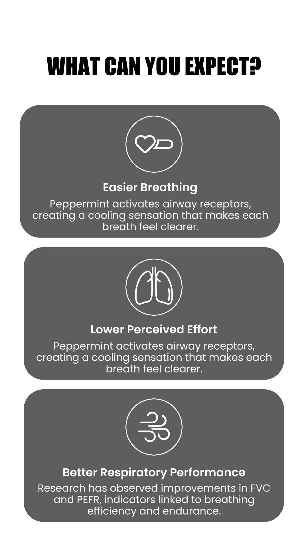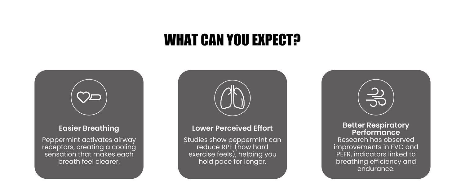 Within seconds, most athletes feel a cold, clean rush through their airways. Like taking your first deep breath on a freezing morning. Your breathing feels clearer, lighter, and less restricted. That sensation alone has had athletes reporting fresher breathing and lighter effort.